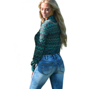 Cowgirl Tuff Women's Long Sleeve Aztec Stretch Jersey-Green/Grey