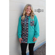 With bright turquoise & a beautiful aztec pattern, you are sure to be the talk of the town in this jacket