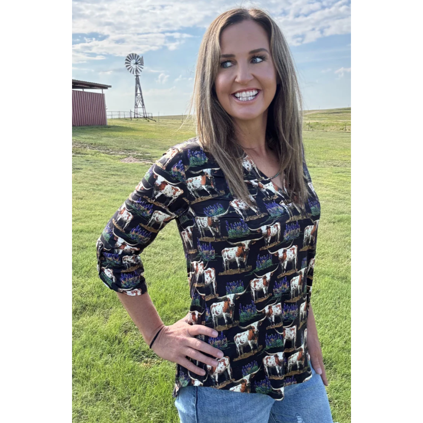 - Embrace Texas spirit with the Heart Of Texas Top, featuring stylish quarter sleeves and an eye-catching design of long horns and blue bonnets