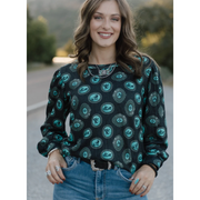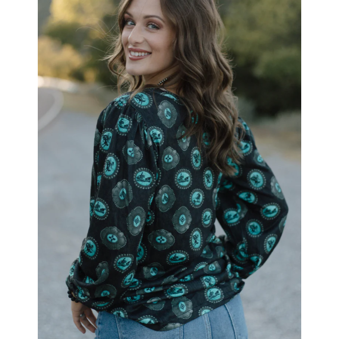 - Elevate your style with the Silver Draw Top, featuring striking turquoise conchos etched with intricate western designs