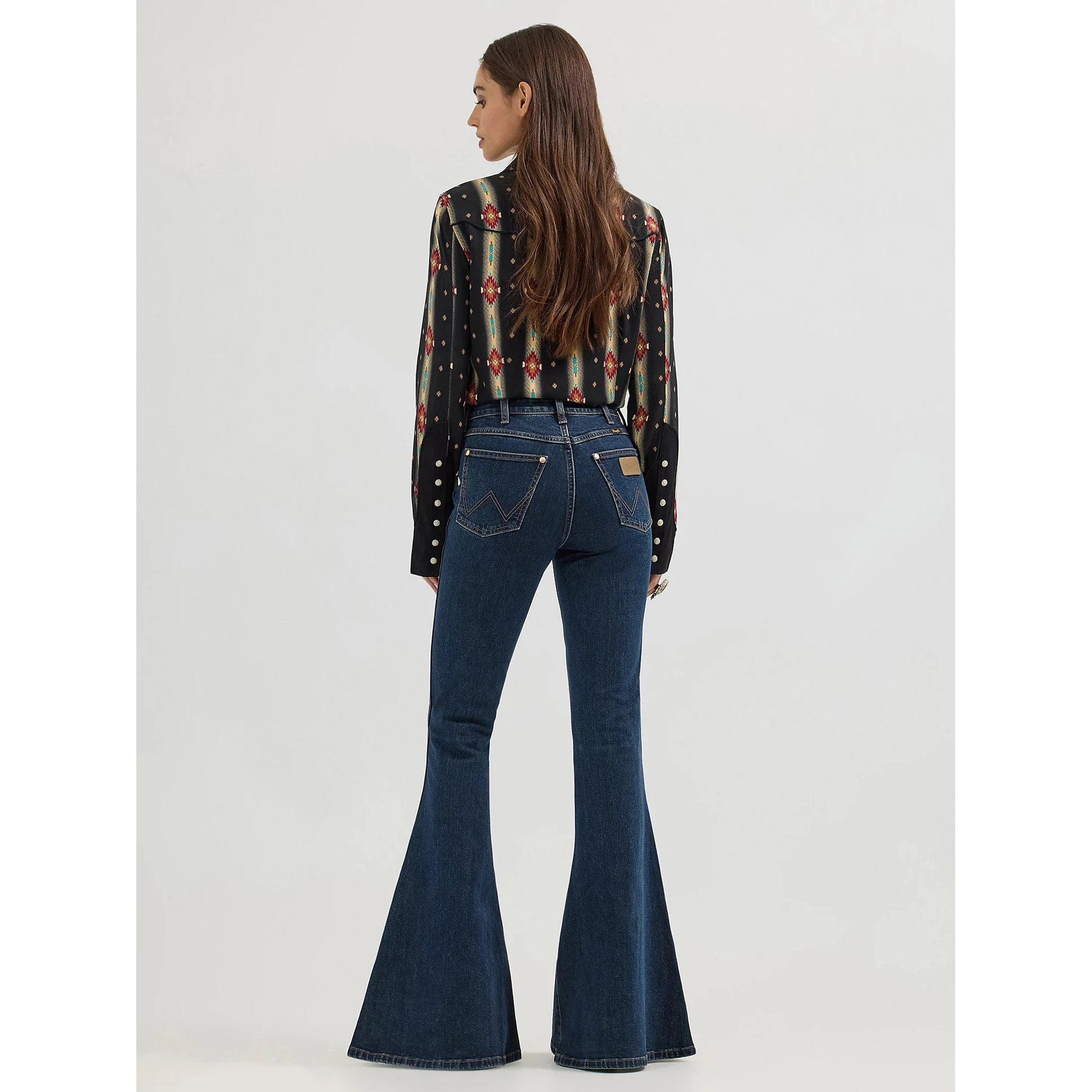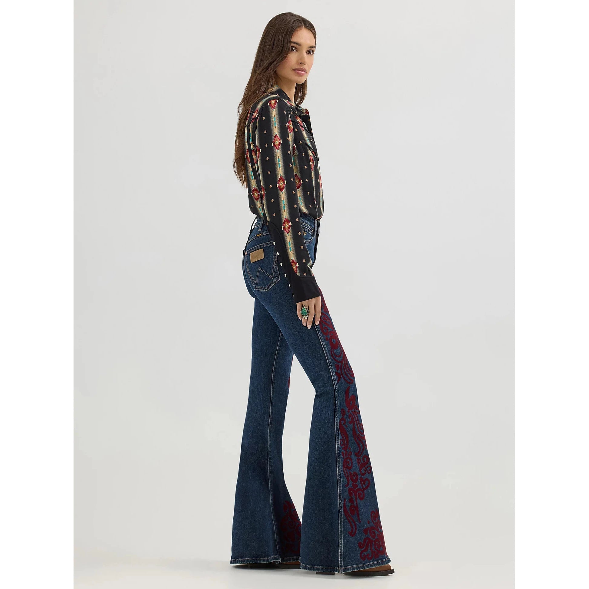 Wrangler Women's Lainey Wilson Vintage Flock Flare- Maroon Dark Wash