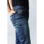 The dark 13 oz denim features 1% spandex for all day wear and rebound, hand sanding with whisker details and rear pocket details