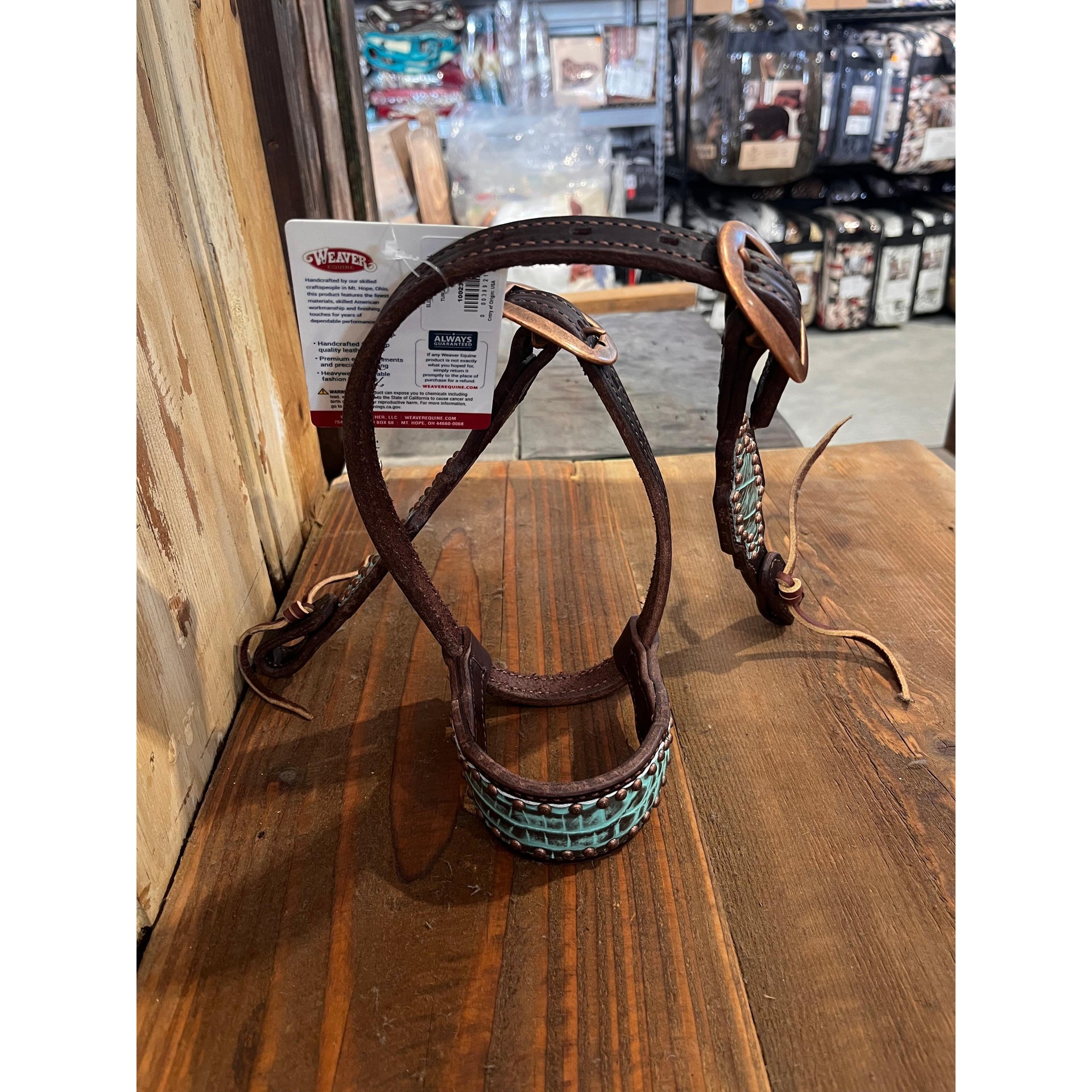 • Striking turquoise crocodile overlays lend added style to browband, ear, and cheekpieces of these headstalls