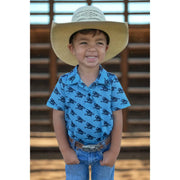 - This beautiful blue polo features a charming spurs pattern that transforms your little cowboy into the cutest wrangler on the playground