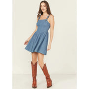 Rock & Roll Women's Denim Buckle Square Neck Mini Dress-Medium Wash