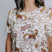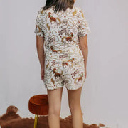 - The short-sleeve top boasts a relaxed fit with a classic rodeo-inspired print, complete with cowboy hats and lassos, while the coordinating shorts are designed with an elastic waistband for a snug yet comfortable fit
