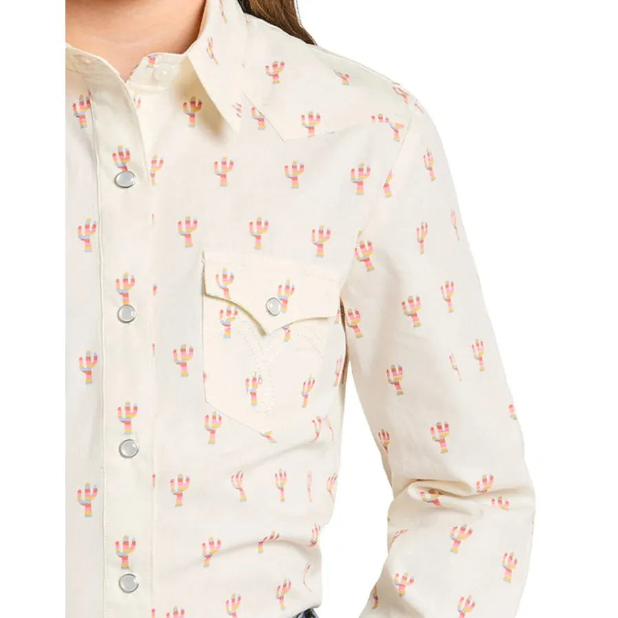 Panhandle Girl's Long Sleeve Print Snap Shirt- Cream