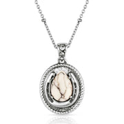 - Ground your look with the Pure Luck Necklace, showcasing a howlite oval stone surrounded by intricate detailing. This piece features a 20 inch chain and captures the calm, organic vibe of nature’s palette and pairs beautifully with matching items. Stone color may vary.