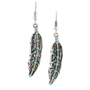 - The silver tone feather has a copper finished vein and small turquoise stones adding a pop of color in the center of the design