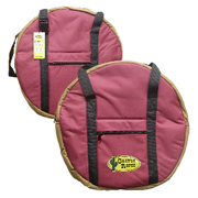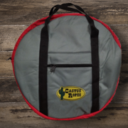 Our Triple Rope Bag can carry up to nine ropes. It is heavily padded and has a burlap lining on the inside. The outside is assembled with a durable polyester material, and it has accessory pockets on both sides. It measures approximately 20” tall x 20” wide x 11” deep.