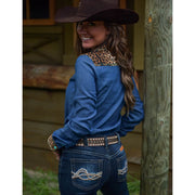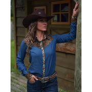Cowgirl Tuff Women's Pullover Button-Up Long Sleeve Shirt - Denim with Leopard