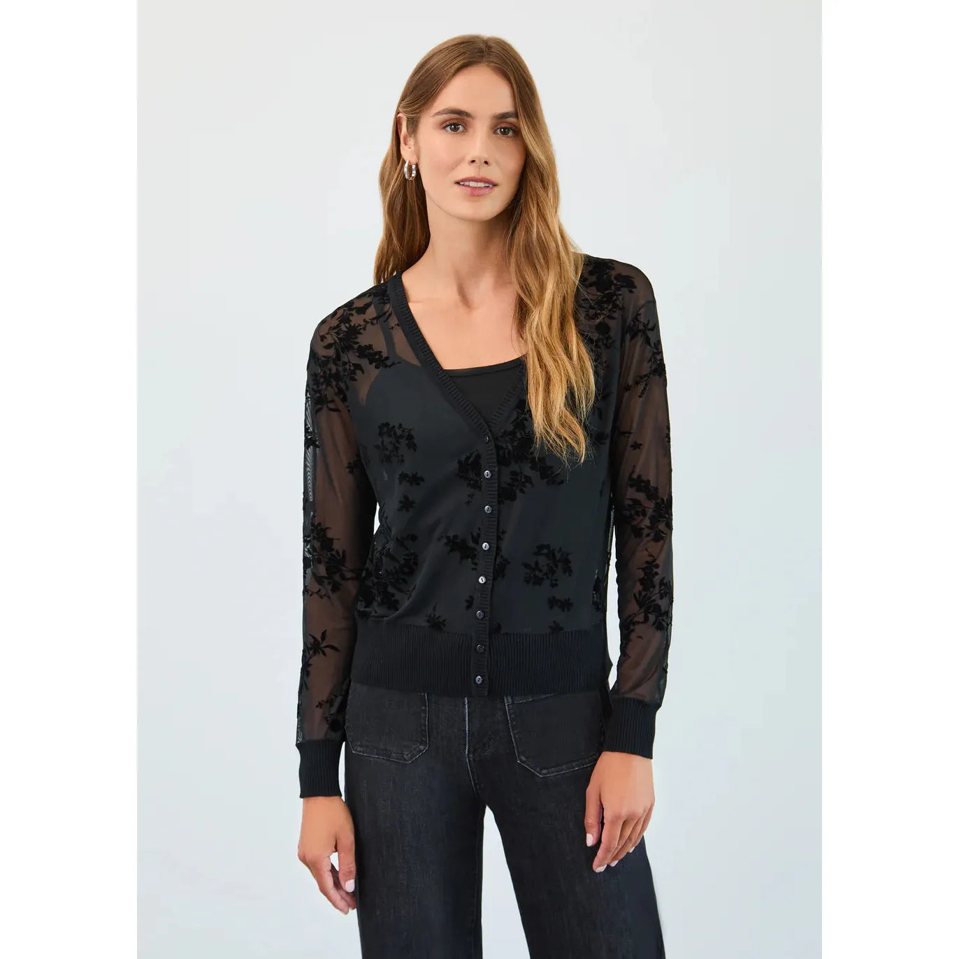- 2-piece set features a sheer mesh cardigan with a button-front closure and a removable cami underneath