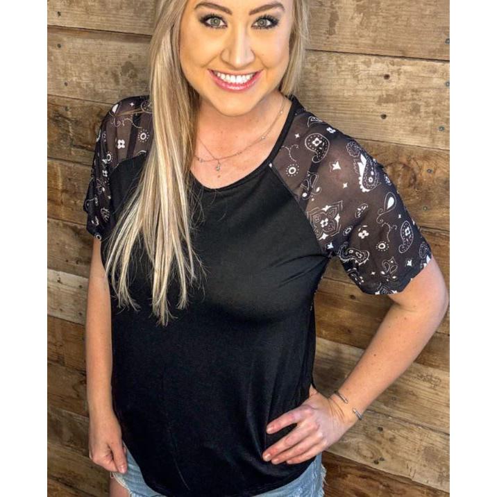 This cute top features a fun mesh half back and paisley sleeves for a playful look