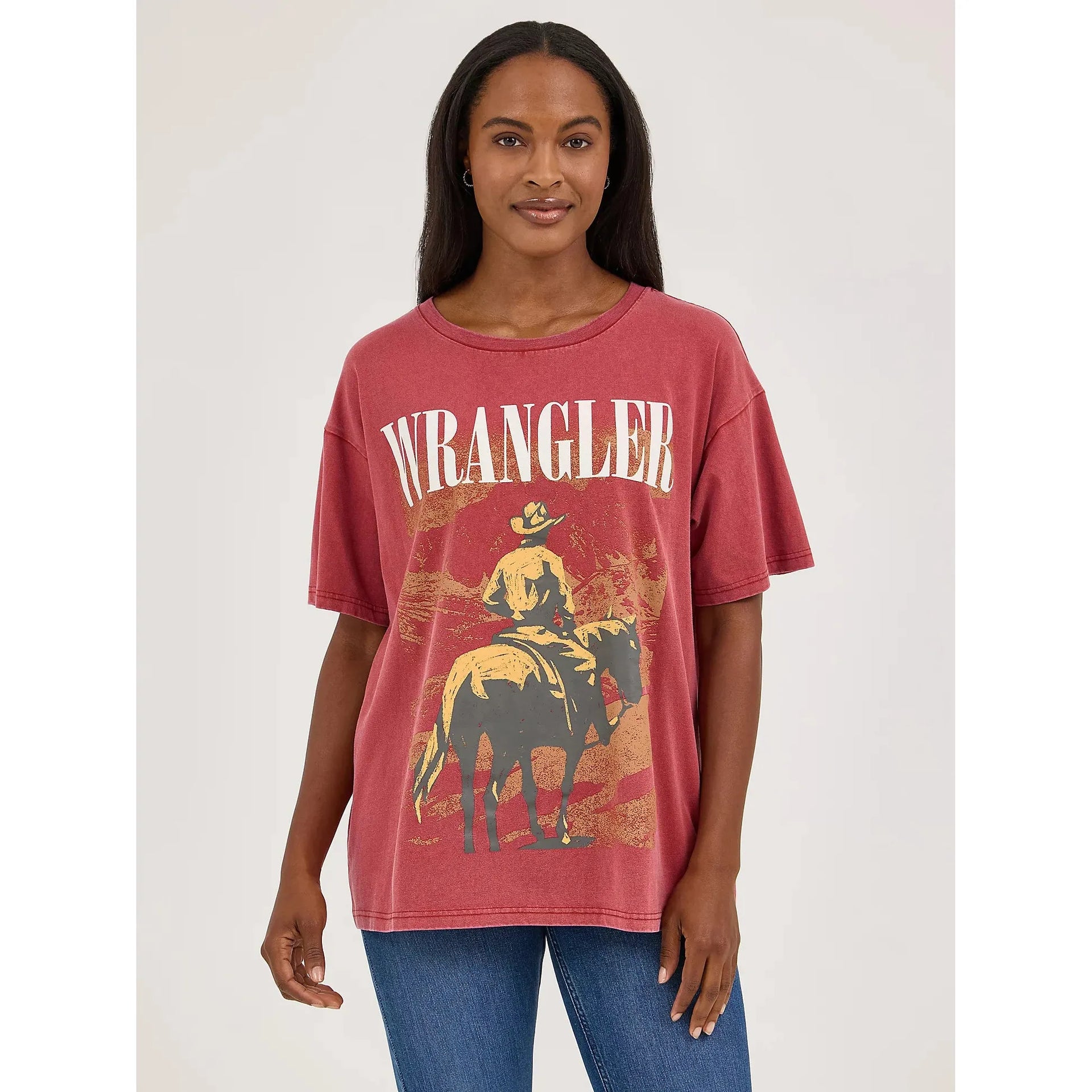 Wrangler Women's Acid Wash Graphic Oversized Short Sleeve Tee Shirt- Chili Oil