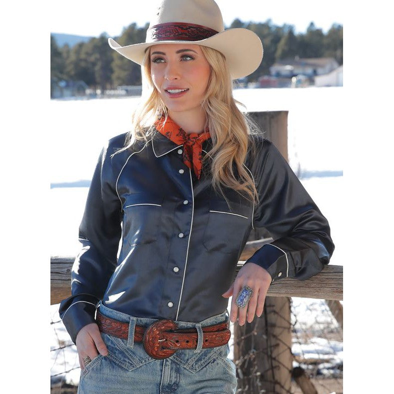 Cinch Women's Classic Fit Long Sleeve Satin Western Shirt- Navy