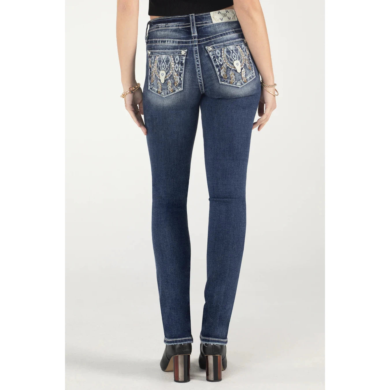 Miss Me Women's Aztec Dreamcatcher Horseshoe Mid Rise Straight Jeans - Medium Dark Wash