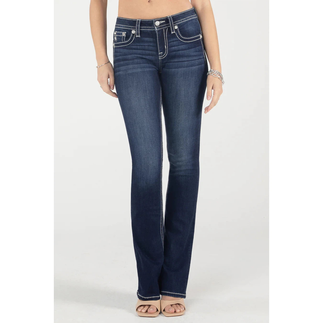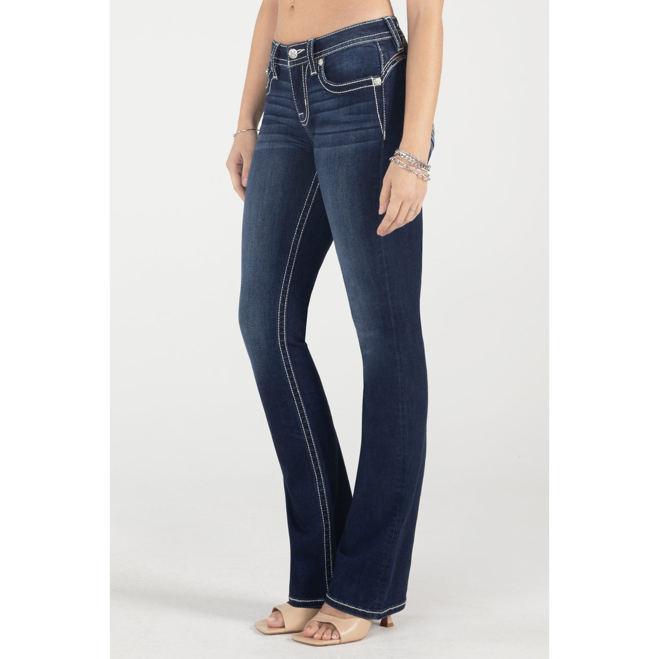 - Mid-rise, dark-wash bootcut jeans