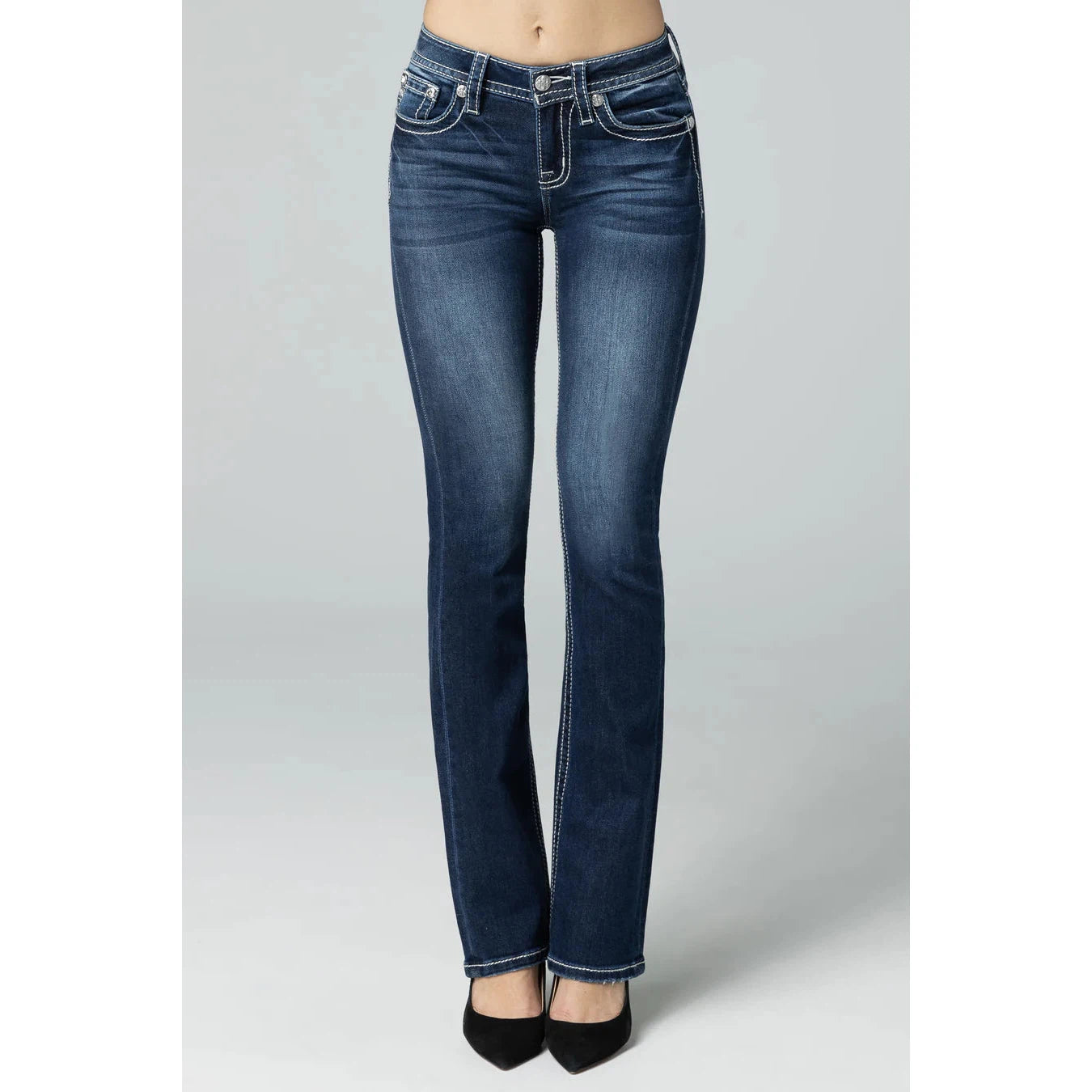 - Mid-rise, dark wash bootcut jeans