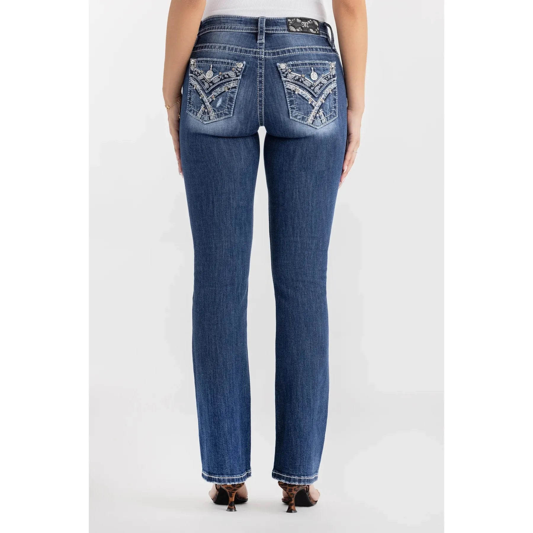 - Embossed black leather cross Miss Me brand patch with paisley embroidery