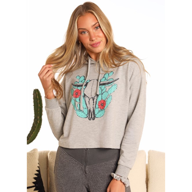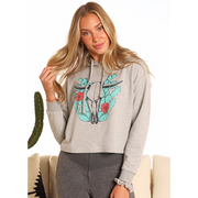 Rock & Roll Women's Long Sleeve Longhorn Graphic Hoodie- Grey