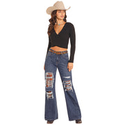 Rock & Roll Women's Patched Distressed Wide Flare Leg Jeans- Medium Wash