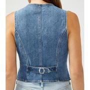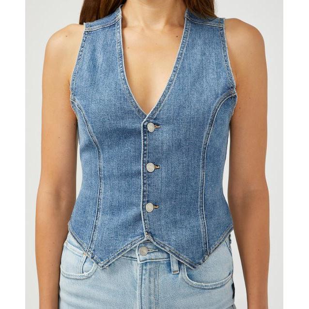- Button front, V-neckline and adjustable back belt for a tailored fit