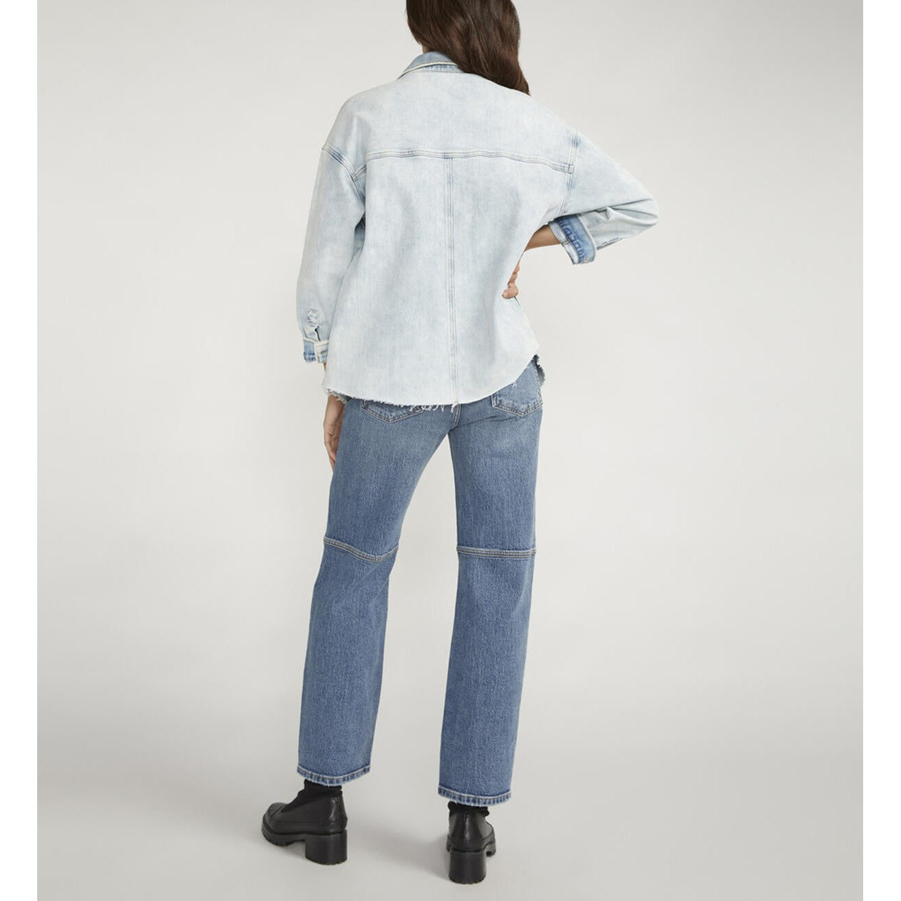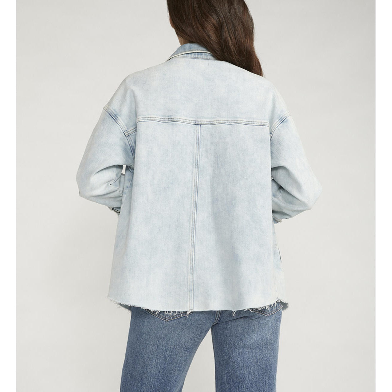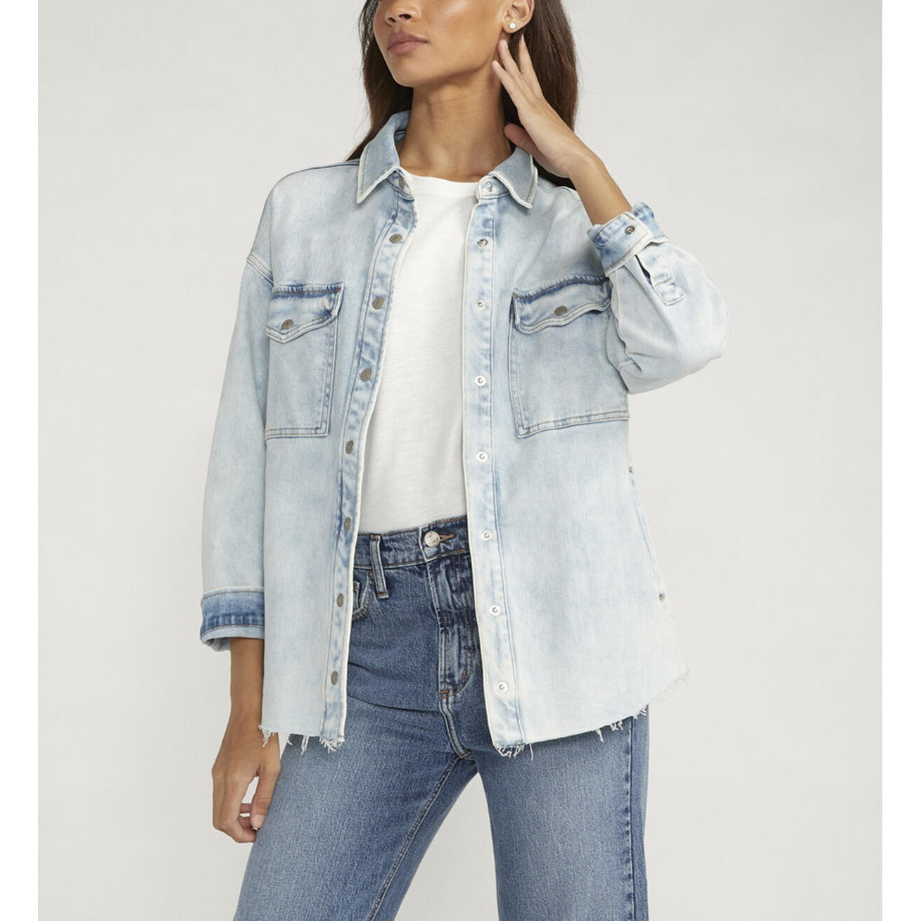- Long-sleeve shacket (shirt jacket) with a medium-light indigo wash