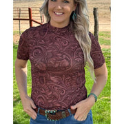 - This unique top features a brown tooled leather print and high neck, adding a touch of rustic charm to any outfit