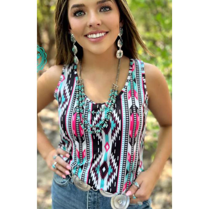 - This stylish top features a charming black, tan, pink, and turquoise aztec print