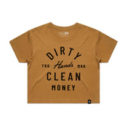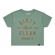 - "Dirty Hands Clean Money" is emblazoned on the front of this crop top—an excellent choice for anyone who respects the value of labor, sweat, and grit. Made from 100% cotton, this crop top is designed for maximum comfort and breathability. Enjoy a comfy, relaxed fit while showing off your support for the blue-collar lifestyle.