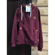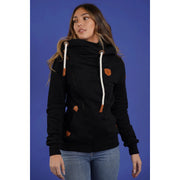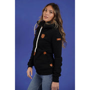 - Cowl neck hood with adjustable rope drawstrings and vegan leather caps