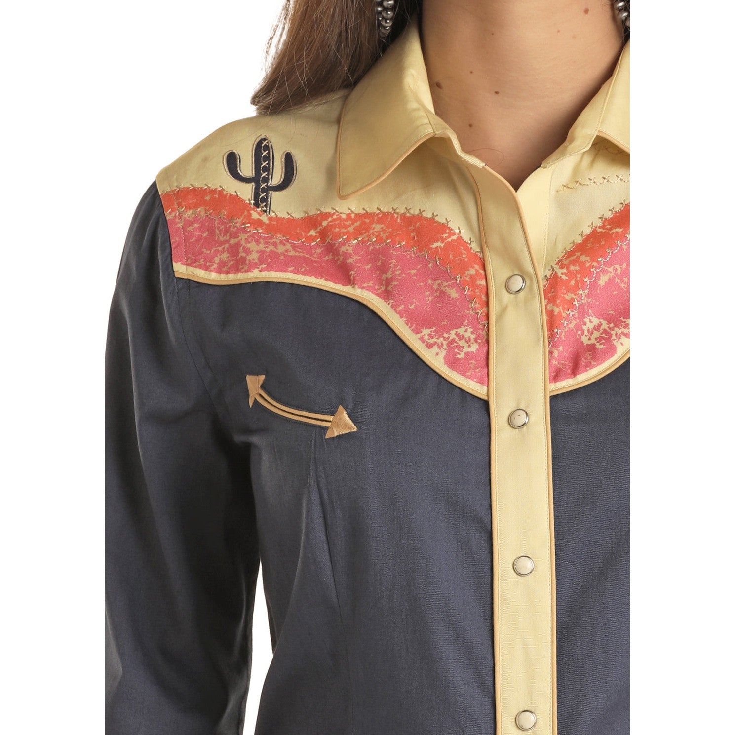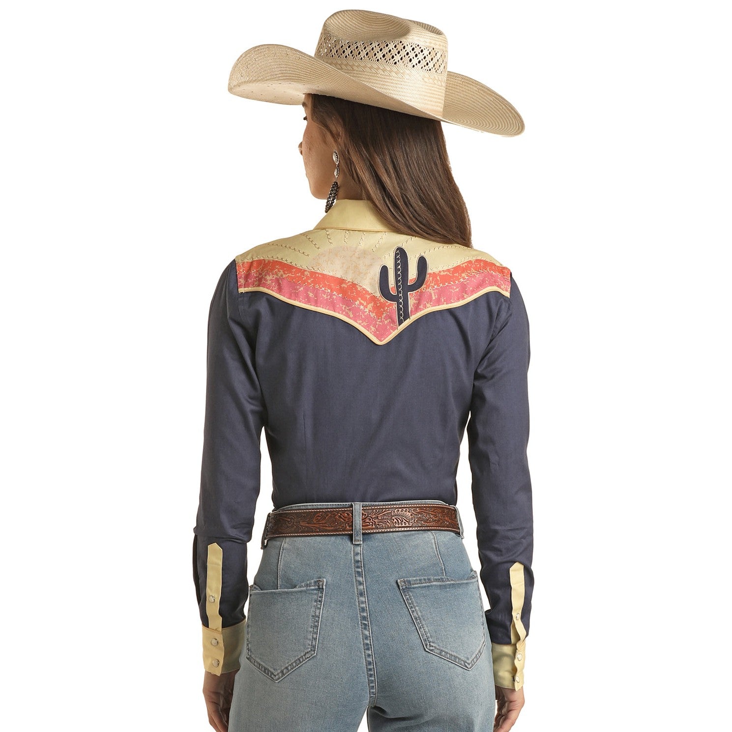 Panhandle White Label Women's Cactus Sunset Long Sleeve Retro Snap Shirt - Navy