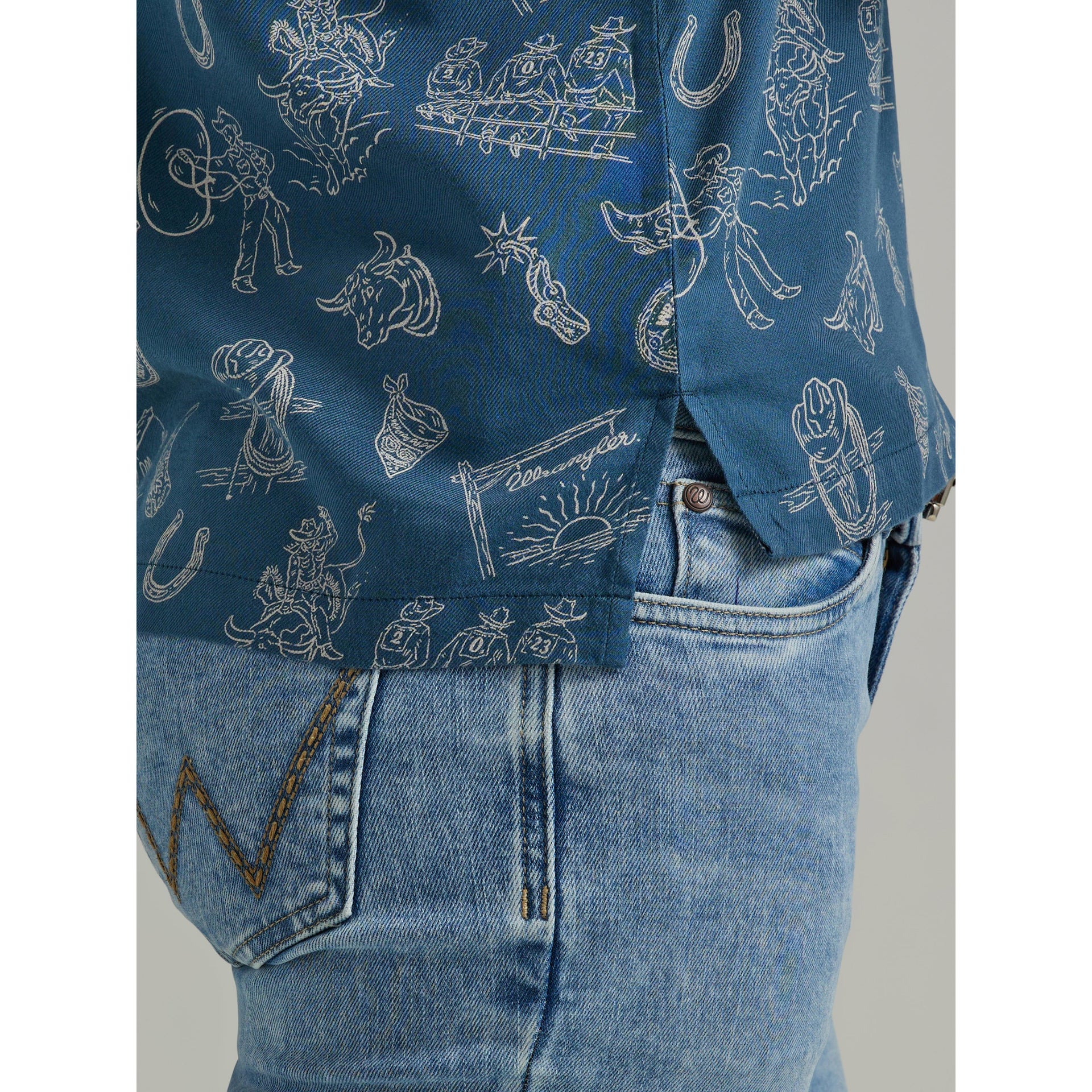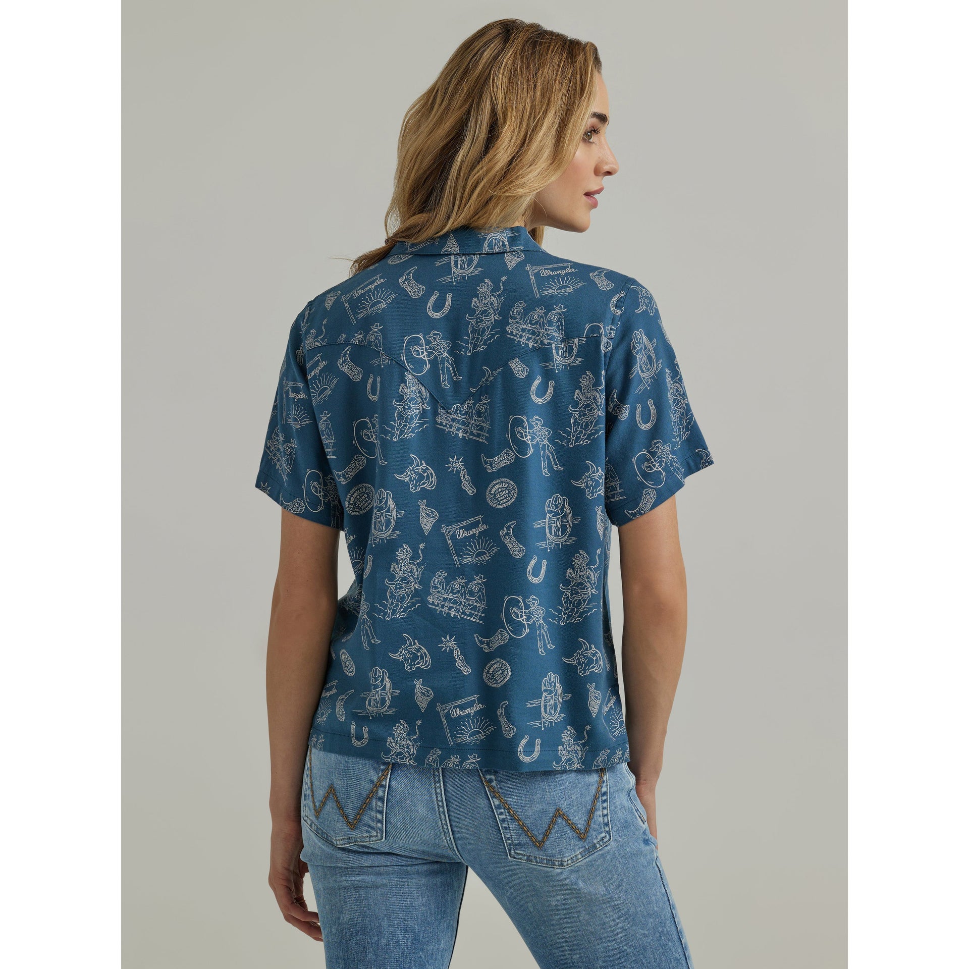 Add a pop of color to your rotation with the Women’s Wrangler Retro® Cowgirl Camp Shirt. Taking a few cues from the cowboy’s look, this collared shirt for women is crafted from a breathable woven fabric blend that’ll only get softer with time. It features short sleeves, a hip length, and a relaxed fit that’s perfect for warm days. Plus, a one-point back yoke, an open lapel collar, and a Western-inspired print deliver the Wrangler® authenticity you want.