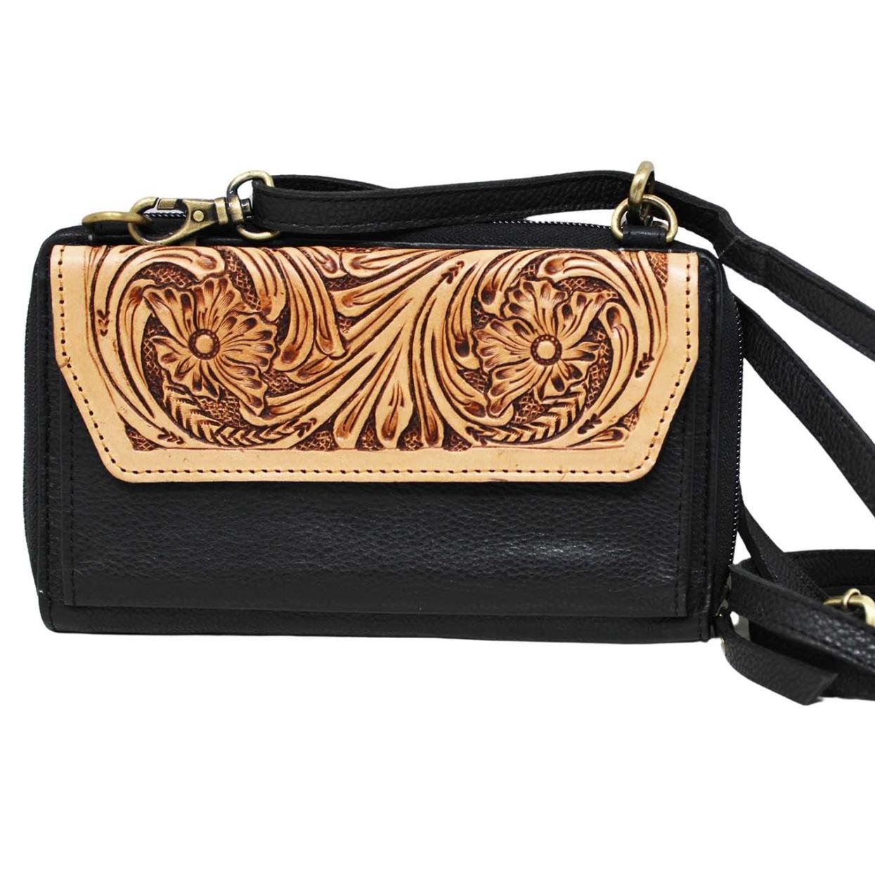Western Women's Floral Tooled Pebbled Leather Sling Crossbody- Black