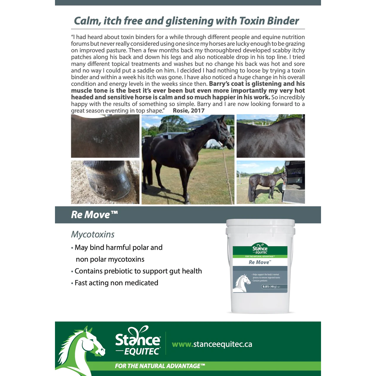- Re Move has been formulated from specific ingredients that may bind harmful mycotoxins in the horse’s digestive tract during periods of high mycotoxin contamination