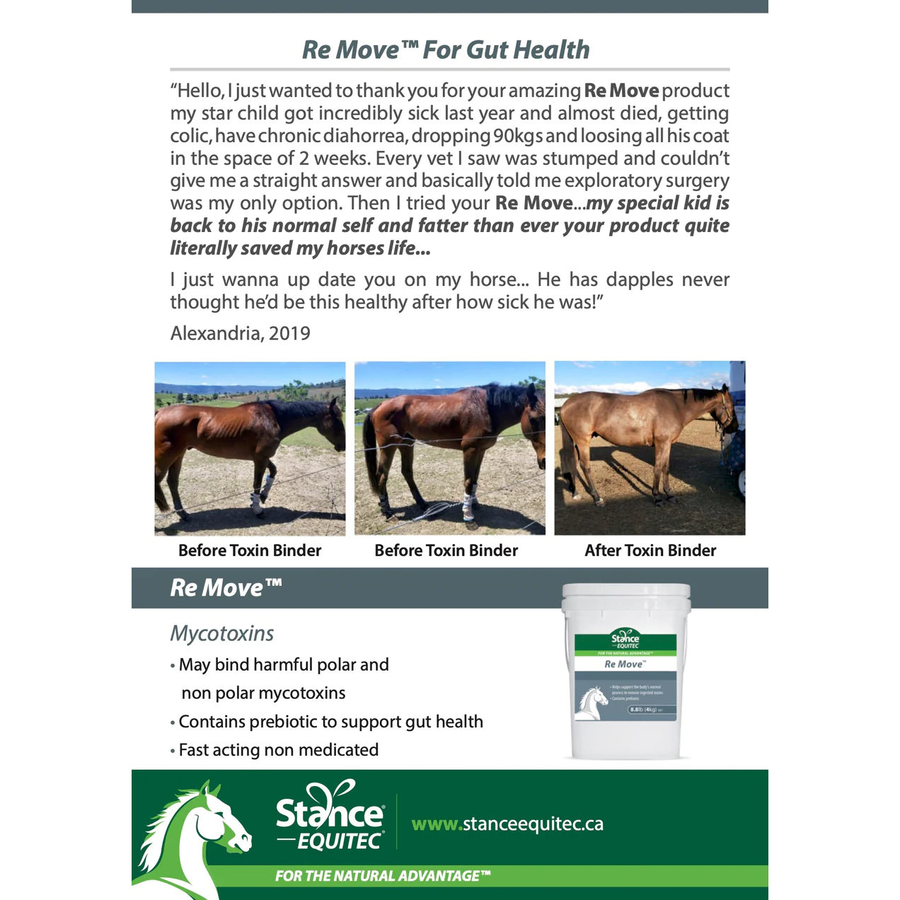 - Re Move has been formulated from specific ingredients that may bind harmful mycotoxins in the horse’s digestive tract during periods of high mycotoxin contamination