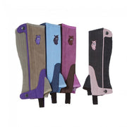 - Synthetic luxury suede half chaps with embroidered horsehead