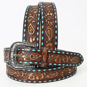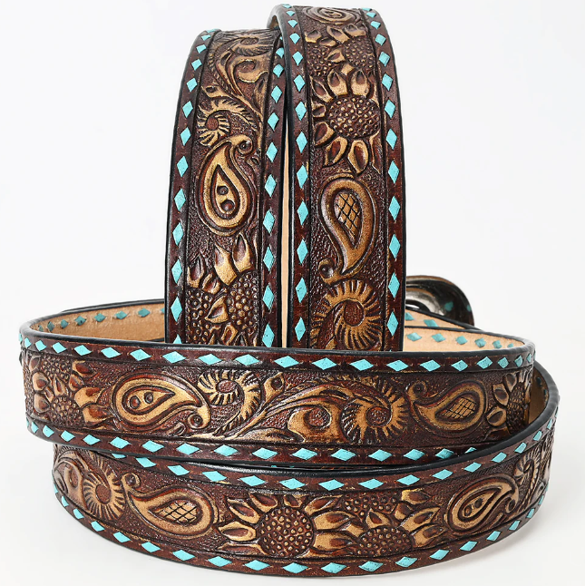 American Darling Tooled Leather Belt - Flower Filigree w/Turquoise Diamonds