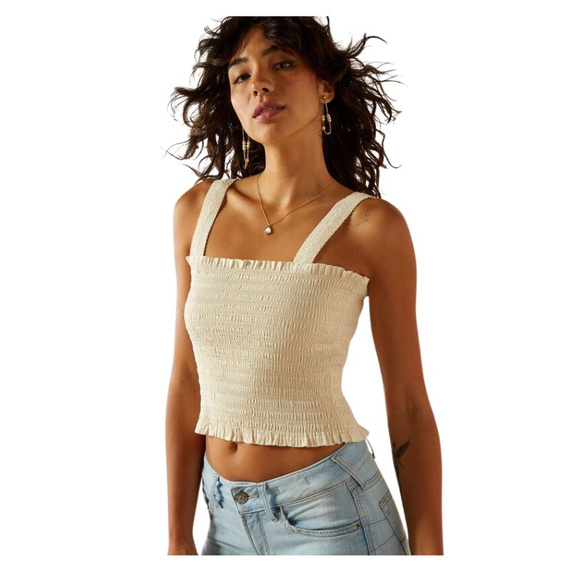 Nothing says summer like a smocked top. A little sweet, a little nostalgic, and a lot flattering, this cropped version is fitted to the body with bra-friendly straps.