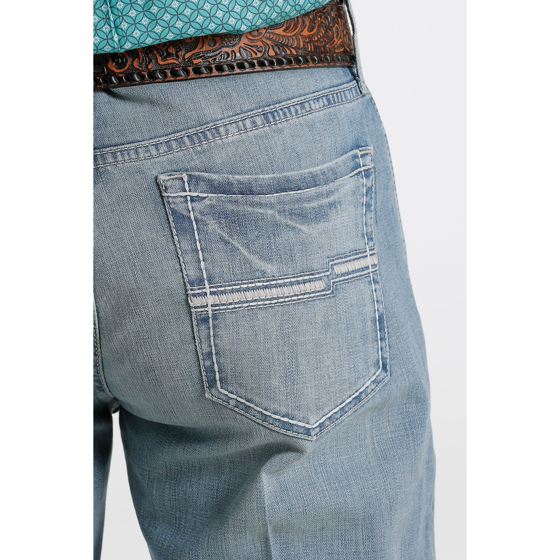 - Beige and silver embroidery line the back pockets of the light stonewash