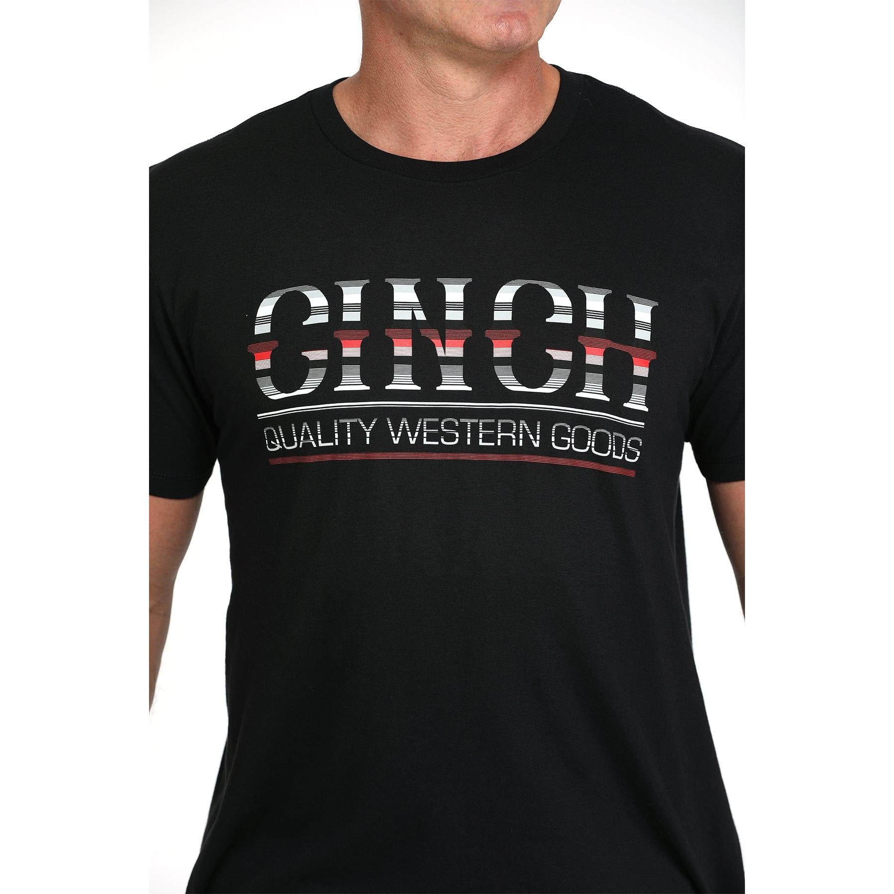 - Gray, black, red, and white serape striped "Cinch Quality Western Goods" graphic on front