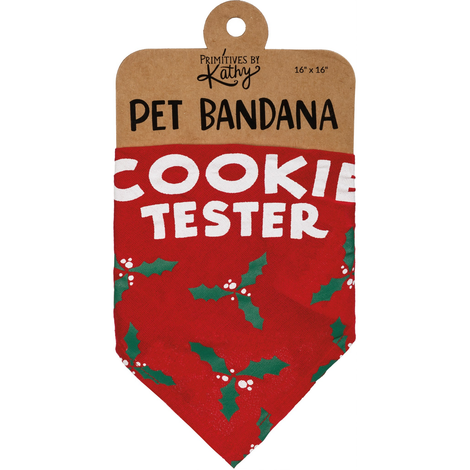 - A small reversible rayon pet bandana featuring a "Cookie Tester" sentiment on one side and "Every Cookie You Bake I'll Be Watching You" on the other with all-over holly designs