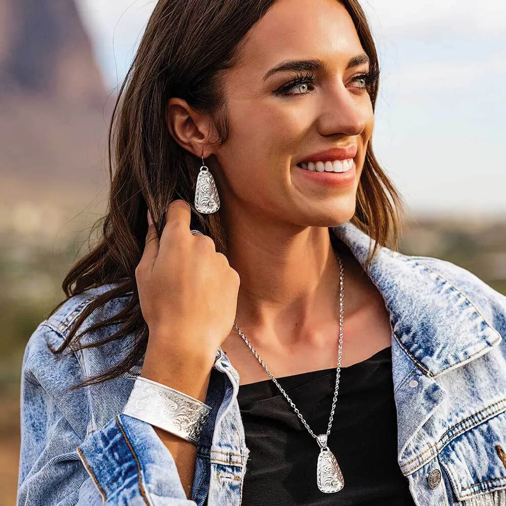 - This silver tone cuff bracelet features classic western filigree for a striking pop of shine