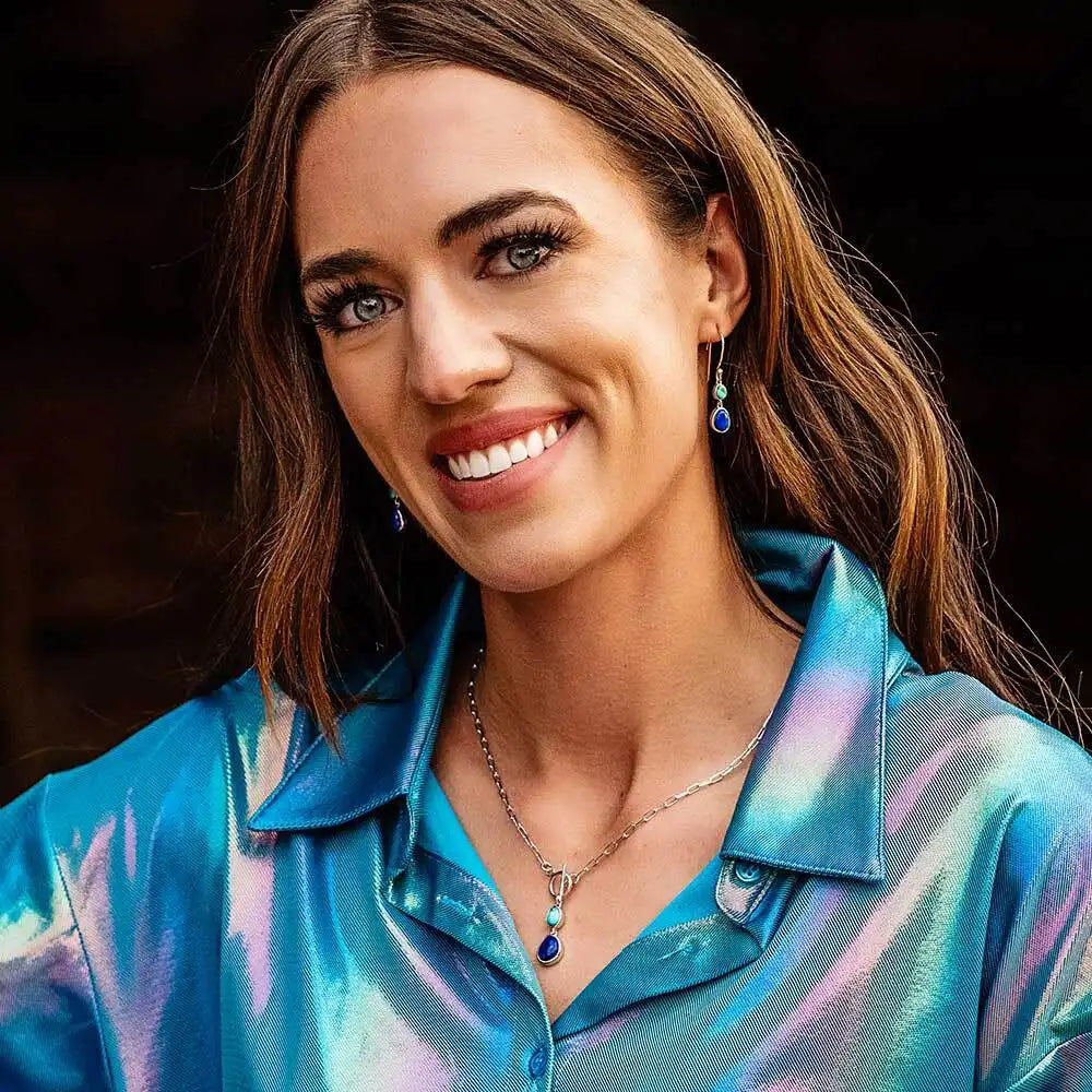 - This necklace features a turquoise stone, and hanging just below is lapis in a natural shape