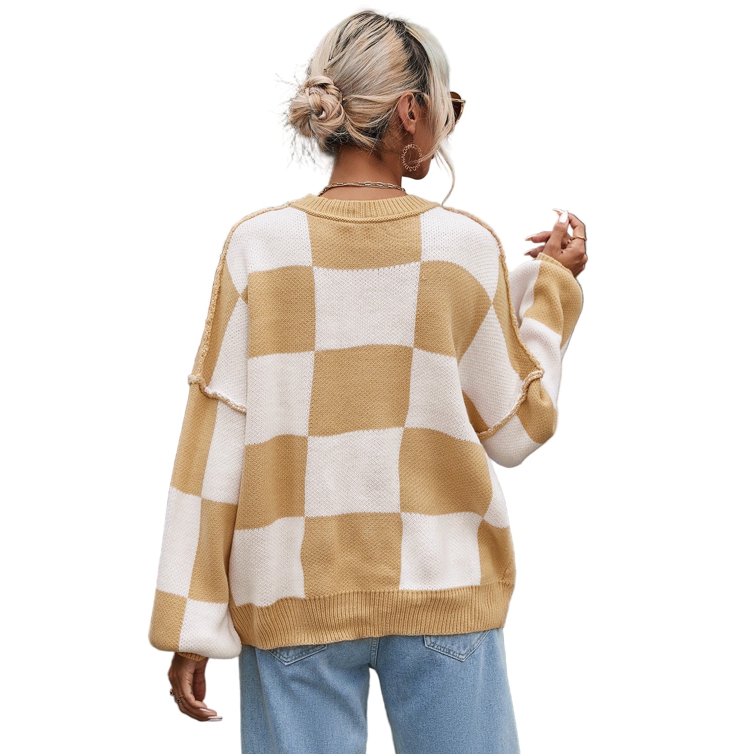 Dear Lover Women's Checkered Bishop Sleeve Sweater - Khaki