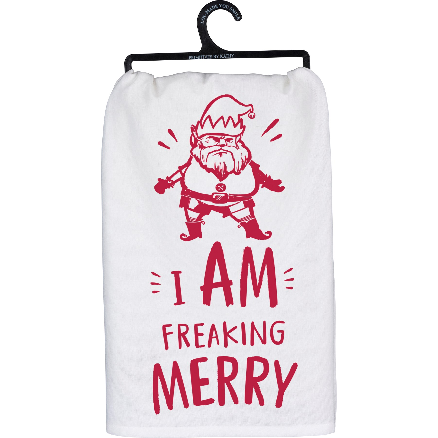- Complementary to a variety of kitchen decor styles; a cotton dish towel featuring an "I Am Freaking Merry" sentiment with an elf design