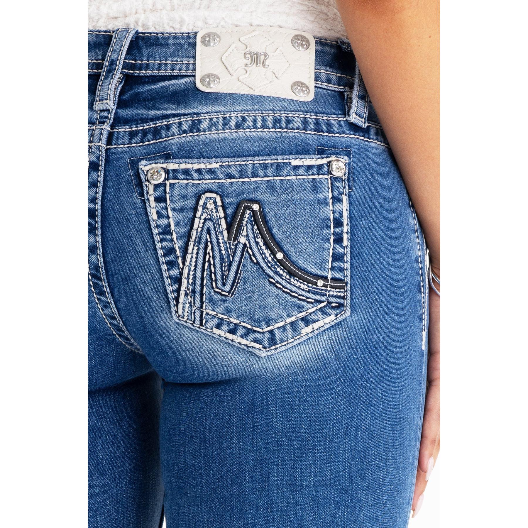 - Raised denim and leather applique' Miss Me logo