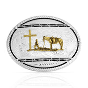 Faithful, fearless, and forged in purpose. The Relentless Christian Cowboy Buckle tells a powerful story of devotion with a detailed gold tone cowboy kneeling before the cross, his horse standing faithfully beside him. Surrounded by classic Western scrollwork and barbed wire edge detailing. This buckle captures the spirit of a cowboy who rides with purpose and bows in faith. Standard 1.5 inch belt swivel.
