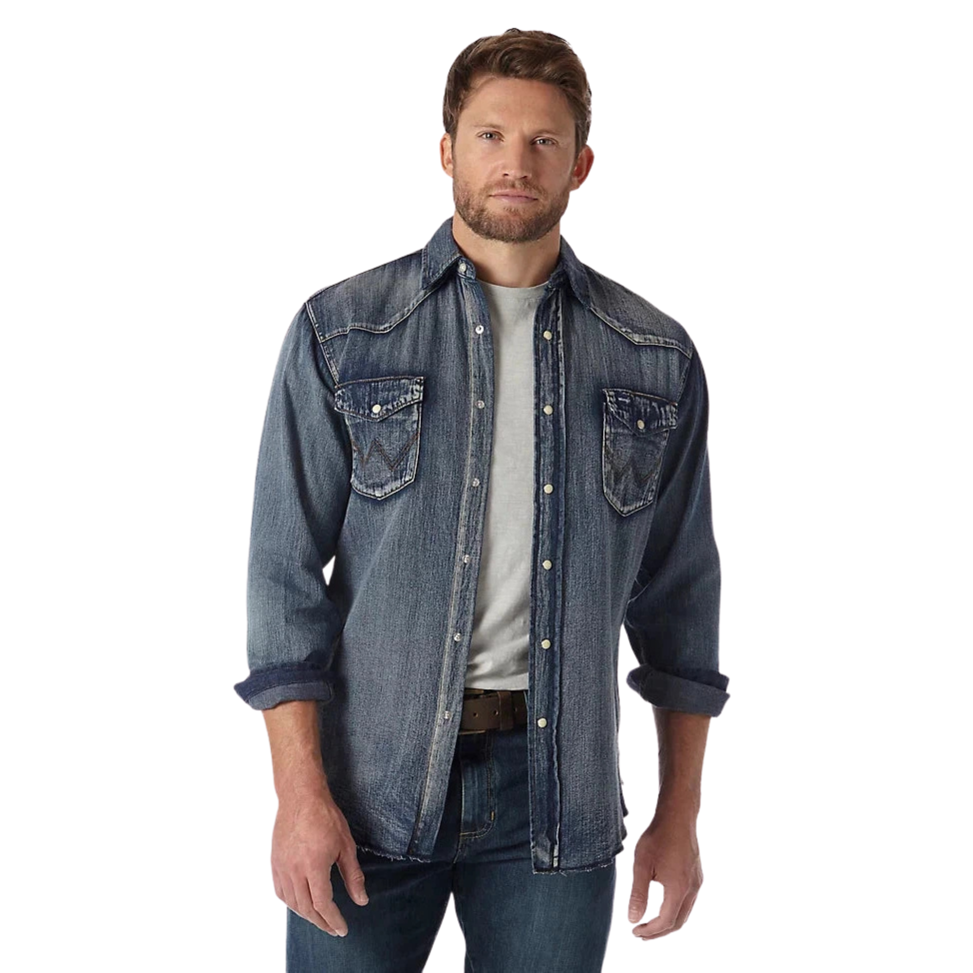 Wrangler Men's Cowboy Cut Long Sleeve Western Denim Snap Work Shirt - Antique Blue