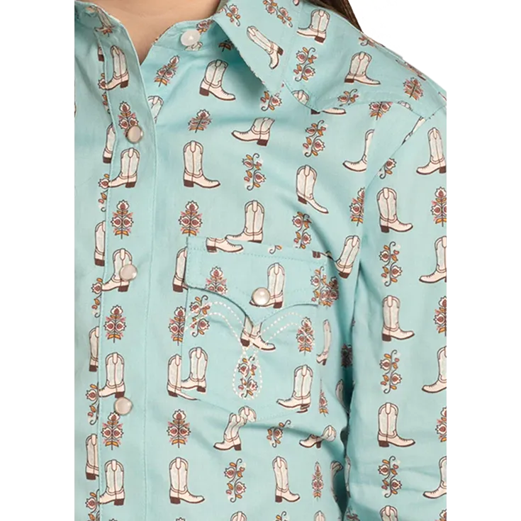 Panhandle Girl's Long Sleeve Snap Print Shirt- Turquoise